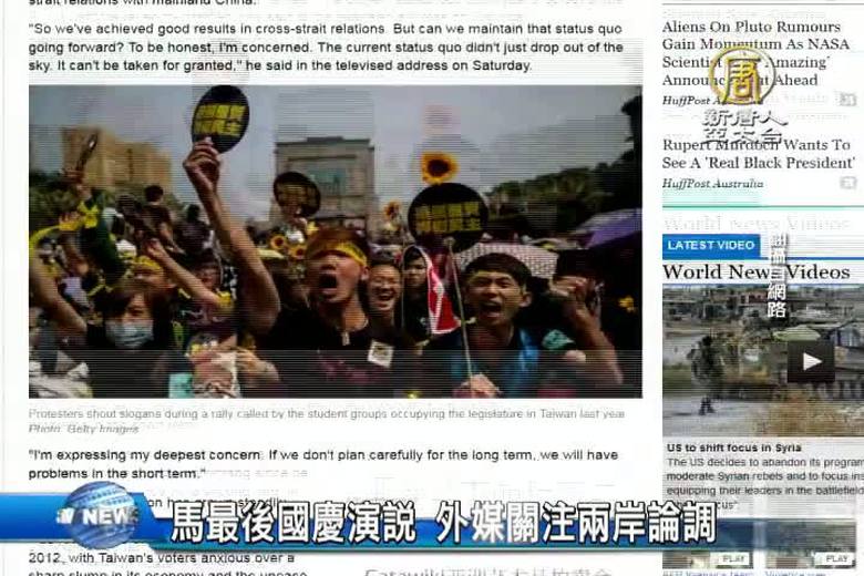新聞頭條,馬上帶您看到,今天是中華民國104歲的生日。也是馬總統任內最後一次發表國慶演說。馬總統說,過去七年兩岸政策沒有親中,也沒有賣台,呼籲下屆領導,應該遵循九二共識,才能維持兩岸現狀,似乎喊話民進黨主席蔡英文,必須遵守「九二共識」。 //asset3.ntdtv.com.tw/public/uploads/assets/2015/10/10/2015-10-10-5618ff775a809.mp4 雙十國慶|九二共識|維持現狀|馬英九|兩岸2016總統大選2015-10-10 20:03:10