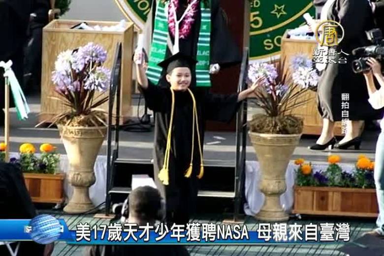 年僅17歲的美國加州少年凱孝虎(Moshe Kai Cavalin)進入美國太空總署(NASA)工作,凱孝虎11歲即拿到數學學士學位。今年年底更將拿到飛機駕駛執照,原本他要攻讀網絡安全碩士,不過,他決定進入美國太空總署工作,暫緩升學。他將這些成就歸功於巴西血統的父親,以及台灣血統的母親。 //asset2.ntdtv.com.tw/public/uploads/assets/2015/11/03/2015-11-03-5638aad199ba8.mp4 2015-11-03 20:34:19