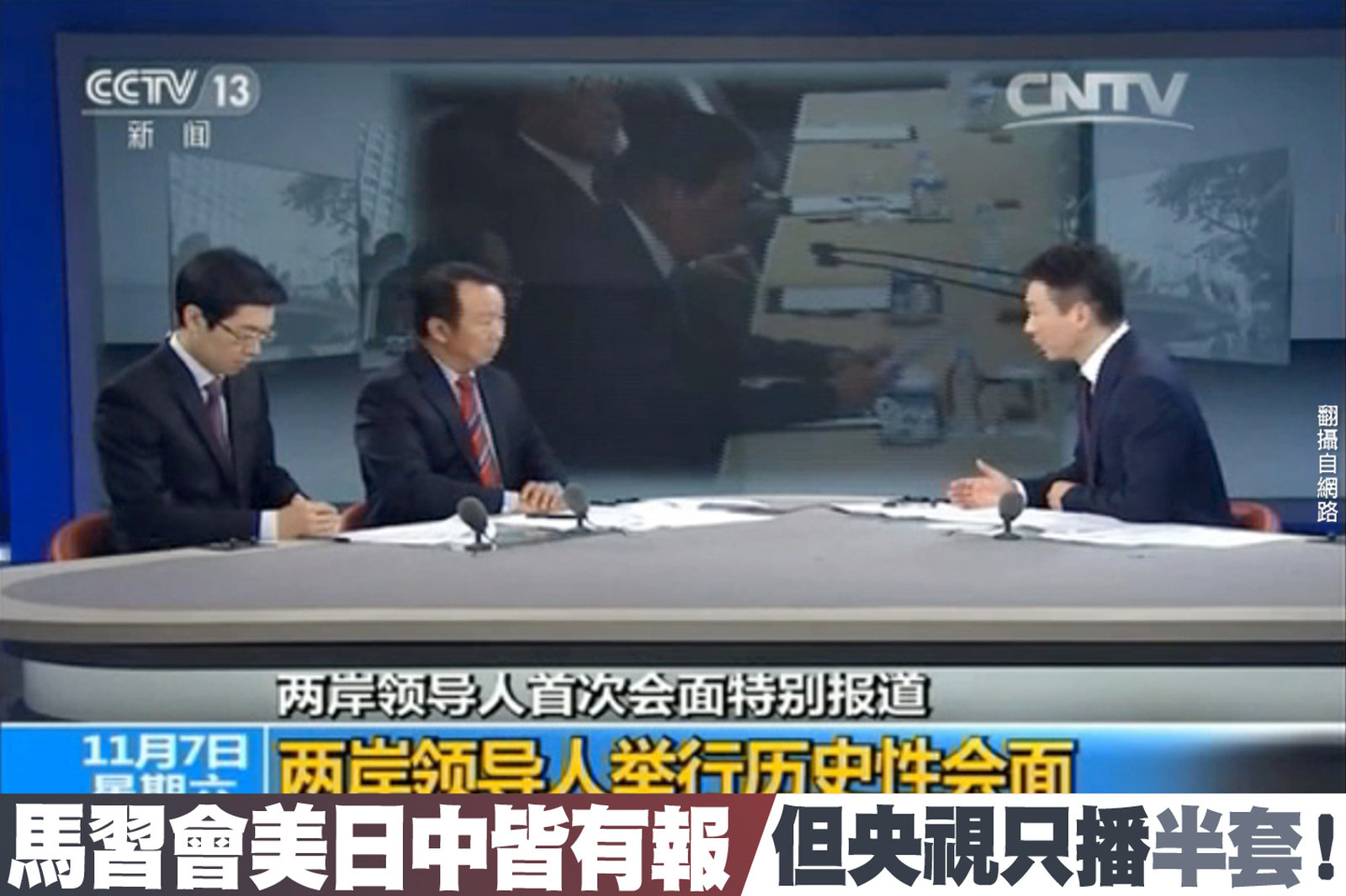 馬習會,在全球媒體聚焦下,國際主流媒體全程直播並作詳盡分析。但央視卻只直播半套,不僅延遲30秒才進馬英九的畫面,他的致詞也只有背景,沒有聲音。 //asset1.ntdtv.com.tw/public/uploads/assets/2015/11/09/2015-11-09-56408da151612.mp4 馬習會|美國|CNN日本|NHK|央視2015-11-09 20:09:07