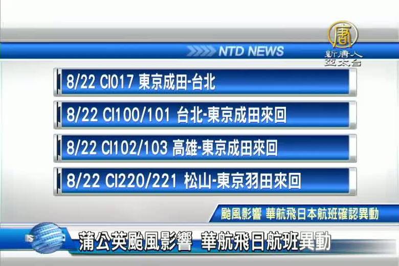 新聞首先帶您看到,受到蒲公英颱風的影響,明天往返日本東京的部分國際班機將視颱風動態調整,目前確認異動的航班有,華航CI017,夏威夷經東京飛往台北的班機。華航CI 100/101,台北-東京來回班機;CI 102/103,高雄東京來回班機,以及,CI 220/221,松山飛東京來回班機。提醒搭機旅客及接機民眾出發前,務必向航空公司確認航班最新動態資訊。 //asset3.ntdtv.com.tw/public/uploads/assets/2016/08/21/2016-08-21-57b999764f3ec.mp4 蒲公英|颱風|華航|航班異動|日本2016-08-21 20:04:11