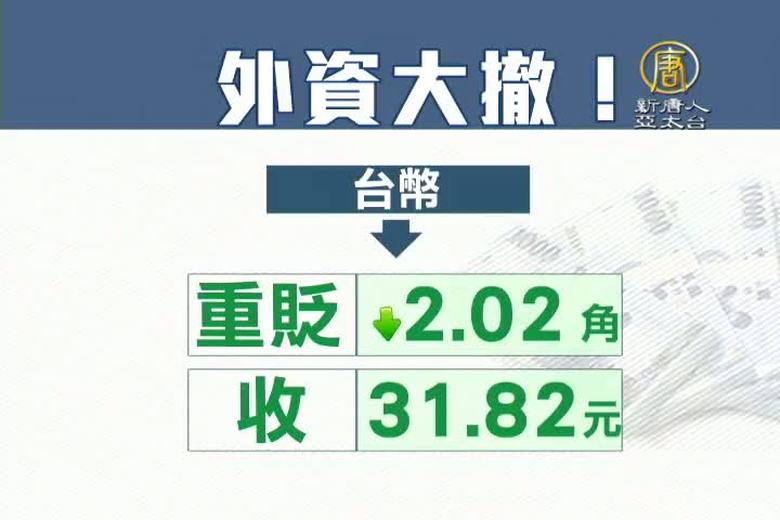 再來看到,外資大舉撤出,新台幣匯率今日走勢疲軟,終場重貶2.02角,收31.82元,台北外匯經紀公司成交量10.89億美元。熱錢持續獲利了結,外商銀行積極買入美元,使新台幣匯率趨貶,再加上台股表現疲弱,助長新台幣貶勢,目前看起來,新台幣暫時還沒有止貶跡象。 //asset3.ntdtv.com.tw/public/uploads/assets/2016/08/22/2016-08-22-57baec2581a30.mp4 外資|台幣2016-08-22 20:11:51