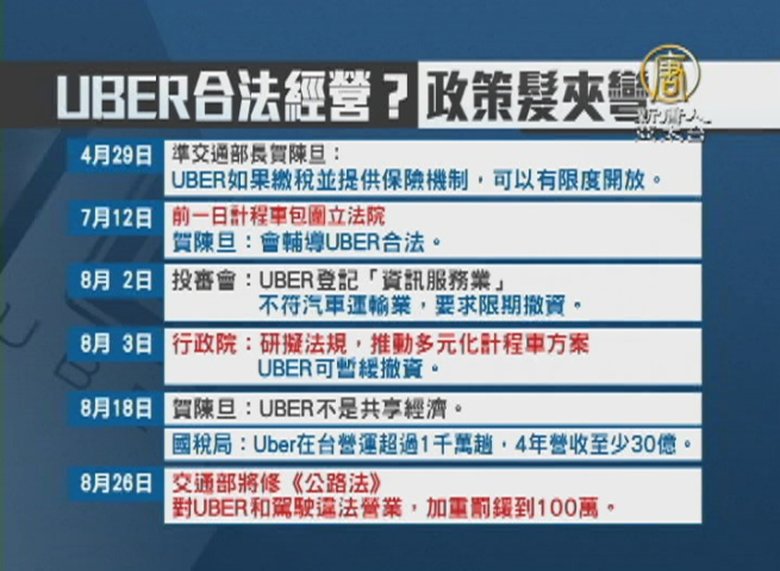 再來帶您關心,計程車業者多次包圍行政院,抗議UBER違法經營,行政院昨天召開跨部會議敲定,不但讓UBER合法經營無望,還要加重罰則,行政院政策再一次,髮夾彎。 //asset1.ntdtv.com.tw/public/uploads/assets/2016/08/27/2016-08-27-57c18588422cc.mp4 UBER|行政院|跨境電商|賀陳旦|交通部2016-08-27 20:16:53