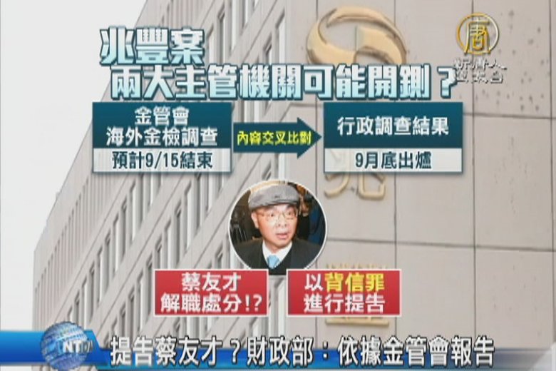 金管會近期大動作約談27位相關人士,金管會主委丁克華指出,後續將資料比對分析後,行政調查結果,預定9月底出爐,而針對造成兆豐金的重大損失,財政部方面不排除提出「背信罪」告訴,提告的對象,就是前兆豐金董座,蔡友才。 //asset3.ntdtv.com.tw/public/uploads/assets/2016/08/29/2016-08-29-57c426d3bd5b1.mp4 兆豐銀涉洗錢|兆豐|洗錢|蔡友才|金管會2016-08-29 20:11:17