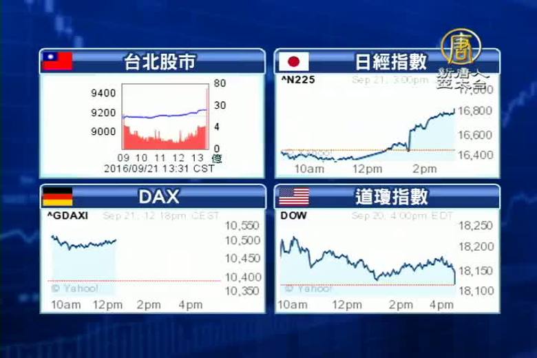 今晚,美聯儲,就要公佈議息結果,儘管升息機率不高,市場觀望氣氛濃厚,外資明顯縮手,帶您看到,今天,亞股中,率先開盤的日本,在11點過後急拉,促使台股特定買盤進場拉抬,電子、金融大型龍頭股回神,拉抬指數回復平盤之上,終場上漲66.92點,以9228.5點作收,重新站回9200點之上。不過,成交量僅709.31億元。 //asset3.ntdtv.com.tw/public/uploads/assets/2016/09/21/2016-09-21-57e27a0a83680.mp4 聯準會|台股|日股|日本央行|電子股|fed2016-09-21 20:11:32