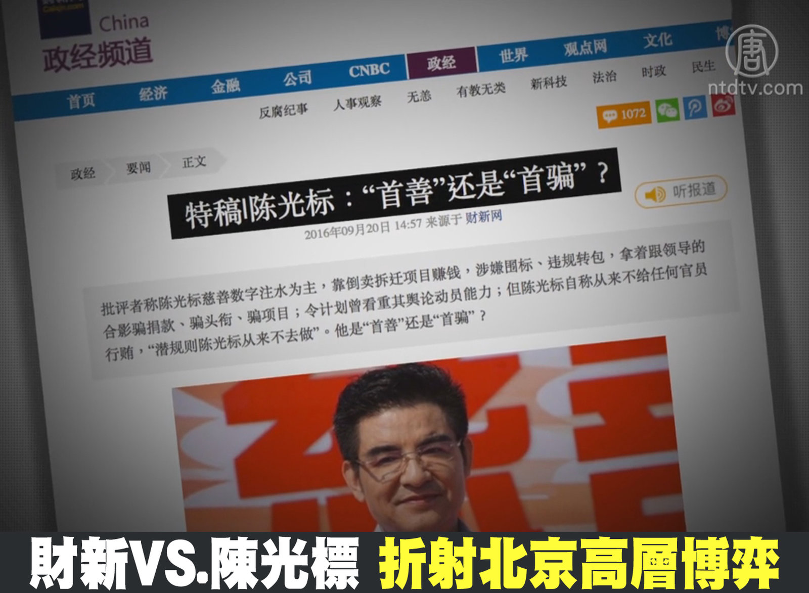 被認為與中共中紀委關係密切的媒體《財新網》,日前長篇報導,起底 中國商人陳光標涉嫌經濟犯罪,背後還有令計劃、李東生等政治勢力。陳光標 隨即高調反擊,狀告 財新傳媒,獲得立案。而財新傳媒不以為意,繼續推出視頻,詳細披露 調查陳光標的過程。外界解讀,整起事件背後,是北京高層的博弈。 //asset1.ntdtv.com.tw/public/uploads/assets/2016/09/23/2016-09-23-57e5216fe0804.mp4 財新網|陳光標|中紀委|江澤民|習近平2016-09-23 20:31:43