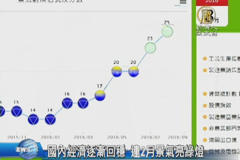 國發會今天公布8月景氣燈號,連續2個月,亮出代表「穩定」的綠燈。綜合判斷分數較上個月增加 2分,達到25分,顯示國內景氣正逐漸回穩。展望未來,國發會認為,行動裝置新品拉貨效應,與新興科技應用產品發展帶動下,出口可望持續改善。但仍需注意世界經濟成長疲乏、美國升息動向,以及美國總統大選等國際因素。 //asset2.ntdtv.com.tw/public/uploads/assets/2016/09/29/2016-09-29-57ed0733b8fdc.mp4 景氣燈號|國發會|景氣2016-09-29 20:16:12