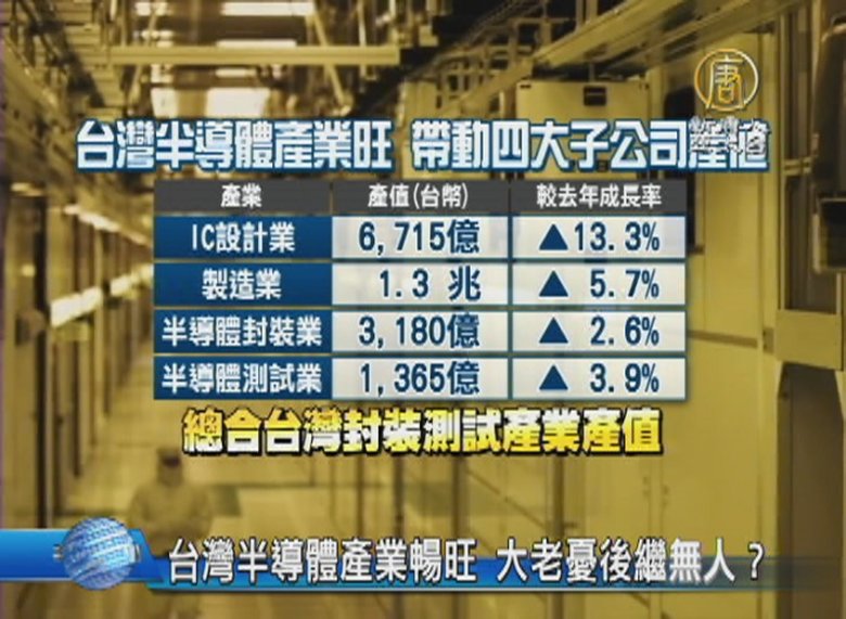 台灣半導體產業持續暢旺,今年成長率可達7.2%,優於全球,不過,產業界大老也擔心,台灣是否有人才可以承接這波榮景,台灣半導體產業協會 2016年會,針對相關議題討論,台積電、聯發科、力晶、聯電及日月光等重量級廠商,應邀出席演講。 //asset1.ntdtv.com.tw/public/uploads/assets/2016/09/29/2016-09-29-57ed108ab8b92.mp4 半導體年會|盧超群|半導體|日月光|吳田玉|力晶2016-09-29 20:59:14