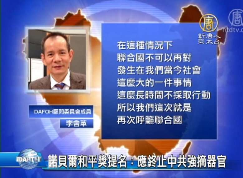 長年關注中共活摘,並在今年獲得諾貝爾和平獎提名的「反強摘器官醫生組織」DAFOH,宣布把今年的10月1日定為首屆「國際反對強摘器官日」,並呼籲聯合國終止中共政權強摘器官的行為。 //asset2.ntdtv.com.tw/public/uploads/assets/2016/10/04/2016-10-04-57f3a1c54c158.mp4 活摘器官|DAFOH|反強摘器官醫生組織|器官移植|法輪功|聯合國2016-10-04 21:03:44