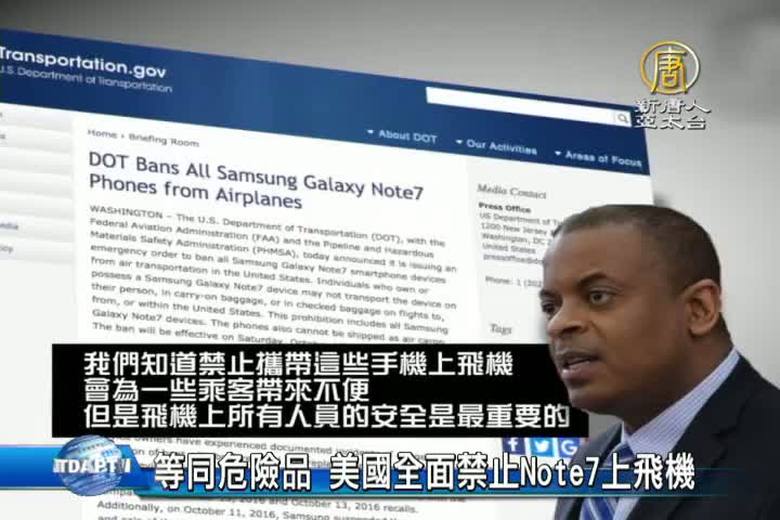 韓國三星智慧型手機Galaxy Note 7,在全球已經出現超過百起爆炸或自燃的案例,由於美國聯邦飛航總署及運輸部發布緊急命令,禁止攜帶Note 7手機,出入境美國。目前,國籍航空有飛美國航線的長榮與華航,都配合禁止旅客攜帶及託運Note 7手機,往返美國。 //asset2.ntdtv.com.tw/public/uploads/assets/2016/10/15/2016-10-15-58021e37682b3.mp4 三星|Note|7|華航|長榮2016-10-15 20:13:38