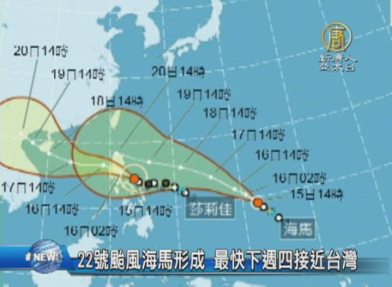 再來帶您看到,今天又有颱風生成,中央氣象局表示,位於關島南方海面的熱帶性低氣壓,上午8點增強為今年第22號颱風「海馬」,以每小時19公里速度,向西北西方向前進。未來將朝向呂宋島北端至巴士海峽一帶移動,下週四、週五距離台灣最近,對台灣影響程度,得看太平洋高壓強弱而定。 //asset1.ntdtv.com.tw/public/uploads/assets/2016/10/15/2016-10-15-58021c1f559f9.mp4 海馬|颱風|第22號颱風|熱帶性低氣壓2016-10-15 20:05:34