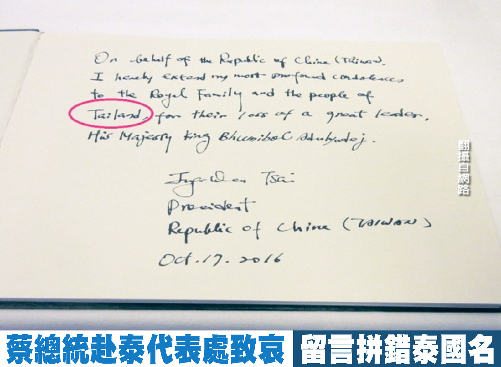 歡迎回來。泰國國王蒲美蓬病逝,總統蔡英文今天(17日)前往泰國駐台北代表處致意。在泰國代表陪同下,蔡英文觀看1963年泰王訪台時的黑白照片,蔡英文說她當時還小,但記得這件事。蔡英文也在留言簿上寫道,向泰國失去一位偉大領袖,致上最深哀悼之意。不過,留言簿上泰國的英文 Thailand 卻拼錯,少寫了一個「h」,顯得有些失禮。對此,蔡英文稍後也透過外交部向泰方致歉,泰方也表示理解,並再次感謝總統以及台灣對泰國人民的關心。 //asset1.ntdtv.com.tw/public/uploads/assets/2016/10/17/2016-10-17-5804c640bc213.mp4 泰皇|蒲美蓬|泰國|國王|蔡英文2016-10-17 20:36:02