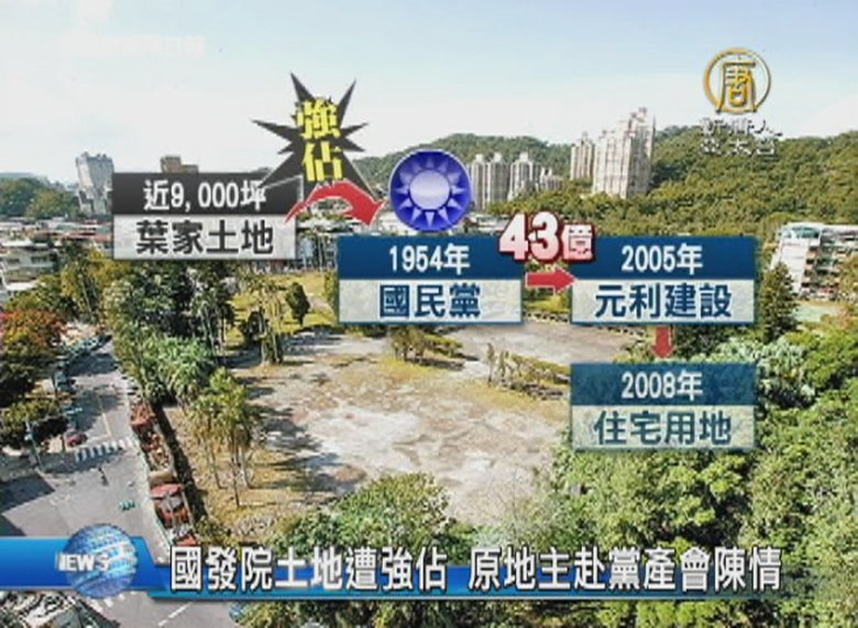 不當黨產處理委員追查發現,國民黨近10年間,名下不動產就減少了將近700筆,而其中受到外界矚目的國發院土地取得問題,原地主兒子葉頌仁,上午也到黨產會陳情,抗議家族 60年來,土地都被國民黨非法強佔。 //asset1.ntdtv.com.tw/public/uploads/assets/2016/10/21/2016-10-21-580a10dd6d0ed.mp4 國民黨|不當黨產|葉頌仁|陳其邁2016-10-21 20:53:39