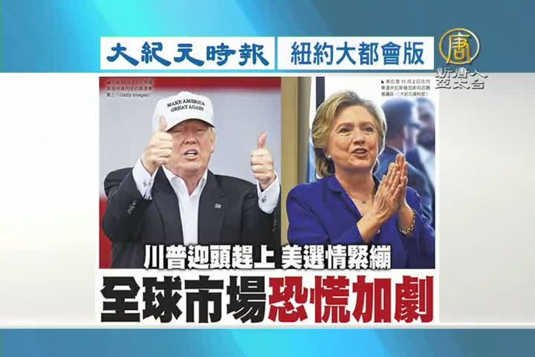 選情膠著,美國股市也陷入焦慮不安,在選前4天,民主黨候選人希拉蕊在兩份民調中,都小幅領先兩個百分點與三個百分點,不過在國際賭盤上押寶川普的買家愈來越多,他們相信選戰結果會和英國脫歐公投民調一樣相反,這場新媒體時代的選戰,鹿死誰手還很難說。 //asset1.ntdtv.com.tw/public/uploads/assets/2016/11/04/2016-11-04-581c7b7c4d717.mp4 美國大選|希拉蕊|川普|賭盤|民調|英國|脫歐|新媒體2017-01-21 15:33:37