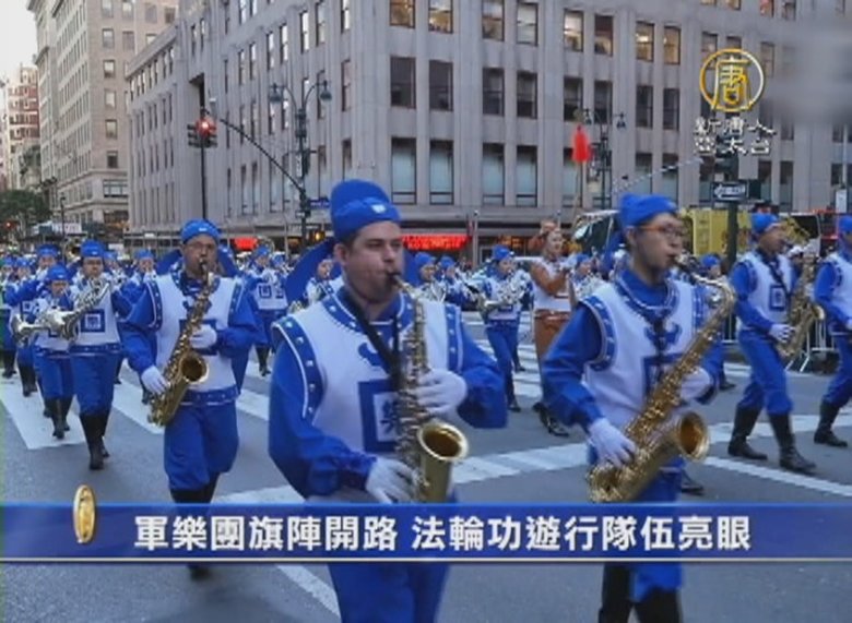 軍樂團旗陣開路 法輪功遊行隊伍亮眼