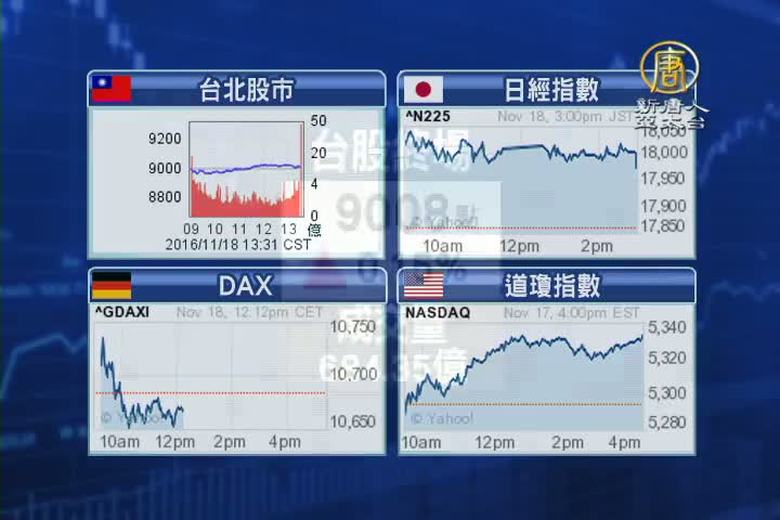 受到美國聯準會年底前可望升息,帶動外資撤出新興市場影響,亞洲股今天走勢分歧,除了日經225指數收盤升到10個月來高點,上漲0.59%,港股恆生指數也上漲 0.37%;韓股KOSPI 指數則是下跌 0.30%。歐股方面則是大多下跌,台北股市今天收盤上漲0.15%,收在9008點,成交量684.35億, 新台幣匯率 因為國際美元續強,今天收盤貶破32元大關,創下近四個月新低,以32.01元兌1美元作收,重貶1.42角,成交量暴增至11.67億美元。 //asset3.ntdtv.com.tw/public/uploads/assets/2016/11/18/2016-11-18-582eefdb656de.mp4 台股|日股|歐股|日圓|新台幣|美元2016-11-18 20:08:26