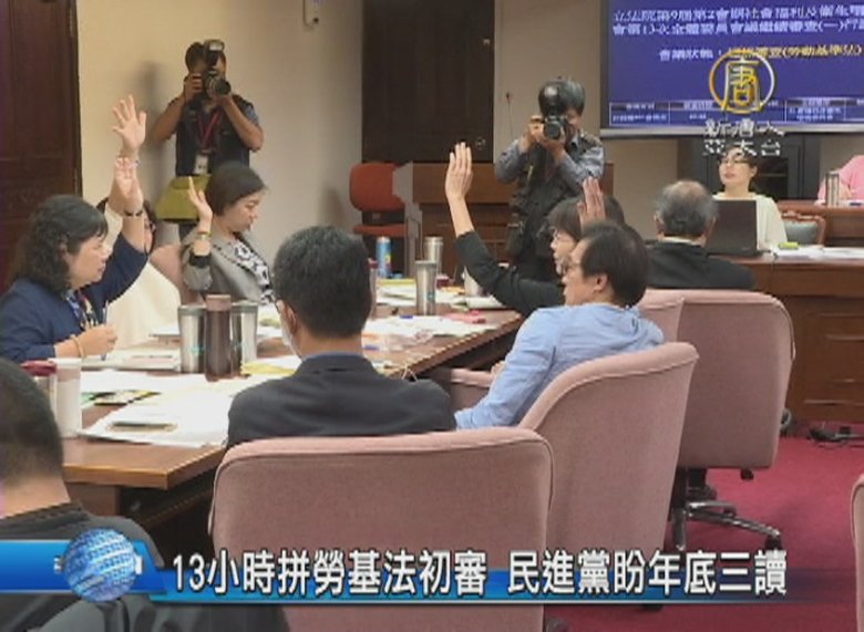 好,那麼昨天(17)晚上,立法院衛環委員會,花了13個小時逐條審查,終於初審通過勞基法攸關一例一休等草案。過程中朝野立委激烈討論,而時代力量立委黃國昌也和柯建銘火花不斷。 //asset3.ntdtv.com.tw/public/uploads/assets/2016/11/18/2016-11-18-582ef26ee592f.mp4 勞基法|一例一休|七天假|衛環委員會2016-11-18 20:20:10