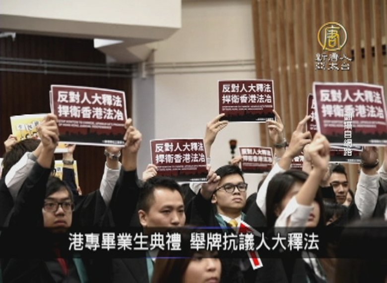 香港專業進修學校(港專)昨天(26日)在馬鞍山分校舉行畢業典禮,40多名畢業生趁典禮奏起中共義勇軍進行曲時,舉起「反對人大釋法,捍為香港法治」的標語。 //asset3.ntdtv.com.tw/public/uploads/assets/2016/11/27/2016-11-27-583ad08860bca.mp4 2016-11-27 20:30:02