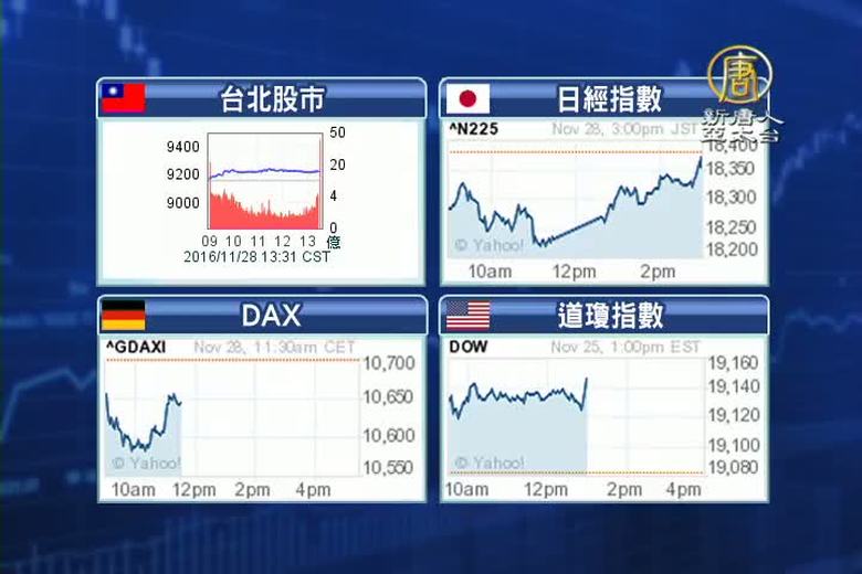 好,展望明年景氣樂觀,接下來帶您看到,今天金融股市行情,美股上周五持續走強,但美元指數持續拉回,部份資金回流亞洲,帶動亞幣轉強。由金融股先行發動、電子股領軍,指數開高走高,攻上9200點 終場加權股價指數上漲63點,收在9222點,成交金額略為放大到712億元。 另外,新台幣終場以31.802元兌1美元作收,勁揚1.4角,創下近半個月來的新高。 //asset3.ntdtv.com.tw/public/uploads/assets/2016/11/28/2016-11-28-583c1efb353ef.mp4 台股|台幣|金融股|電子股2016-11-28 20:07:46