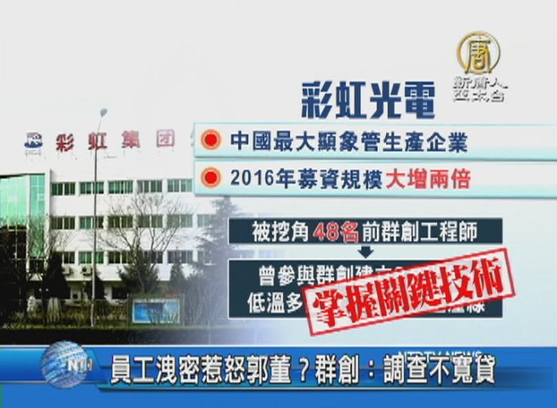 再來看到,有週刊報導,鴻海董事長郭台銘,大動作整頓群創,對48名離職到中國的員工,發出存證信函,因為擔憂這些員工被挖角,讓技術被對岸掏空。對此,群創說,主動調查不寬貸。 //asset1.ntdtv.com.tw/public/uploads/assets/2016/11/30/2016-11-30-583ec46d90303.mp4 郭台銘|群創|彩虹光電|內鬼|竊密2016-11-30 20:17:19