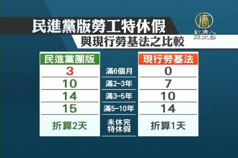 好,總統蔡英文日前拍板,要在年底前通過《勞基法》修法,民進黨團的勞工特休假版本昨天也出爐,條文規定,年資滿6個月可獲3天特休假,前5年的特休假規定 都優於公務員。按照現行勞基法規定,勞工工作滿半年 未滿一年,是沒有特休假的,公教人員也沒有;滿兩年未滿三年,有七天特休,滿三年未滿五年有十天,滿五年有十四天。民進黨團版本,比現行規定的,分別增加了三天、三天、四天及一天。不過勞團認為,民進黨要砍勞工7天國定假,說會增加特休假來補償,結果特休假仍低於公務員,何況勞工特休假不是想休就休,得要雇主同意,因此,對於這個 //asset3.ntdtv.com.tw/public/uploads/assets/2016/12/02/2016-12-02-584165396beaa.mp4 勞基法|特休假|資淺勞工|勞團2016-12-02 20:08:38