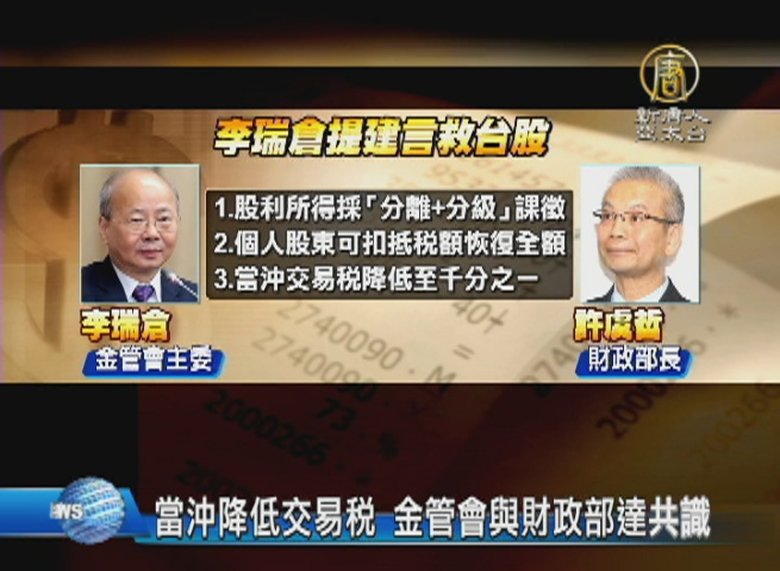 台股量低、資金外流,今年(2016年)截至目前為止,成交量已經跌掉 4.88兆,有分析師預估,全年成交量將創11年來新低!搶救股市大作戰,金管會主委 李瑞倉親自拜會財政部長許虞哲,打算提出降低當沖交易稅 等建言,經過50分鐘密談,許虞哲一派輕鬆說,雙方已經達成共識了。 //asset1.ntdtv.com.tw/public/uploads/assets/2016/12/02/2016-12-02-584174a993eca.mp4 台股|成交量|資金外流|李瑞倉|當沖交易稅|金管會|財政部2016-12-02 21:18:39