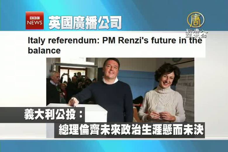 再來看到今天另一個影響金融市場的重要事件,那就是,義大利,在昨天,進行全國公投,慘敗收場。民調顯示,超過54%的民眾投下「否決」票。總理倫齊承諾辭職下台。消息一出,歐元暴跌到20個月以來新低,亞股也受到震盪波及。 //asset2.ntdtv.com.tw/public/uploads/assets/2016/12/05/2016-12-05-58457ae469fe9.mp4 公投|倫齊|義大利總理|歐元|歐盟2016-12-05 22:34:19