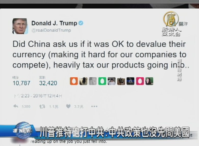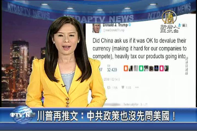 再來看到,美國候任總統川普打破外交慣例,接聽台灣總統蔡英文電話,引起國際熱議,其中不乏許多擔心惹怒中共的聲音。對此,川普今天連發兩則推特,再度向中共喊話, 川普提到,「中共貶值人民幣,讓美國企業難競爭;對美國進口的貨物課重稅,美國沒有對他們徵稅;而且在南海蓋一堆軍事設施的時候有問過美國嗎?沒有吧!」 //asset3.ntdtv.com.tw/public/uploads/assets/2016/12/05/2016-12-05-58457b03c188d.mp4 川蔡熱線|川普|蔡英文|美台關係|美中台關係2016-12-05 22:34:49