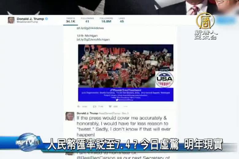 美國候任總統川普,12月4號在推特上,批評中共操控人民幣匯率。12月5號,美元對人民幣的離岸匯率,在貨幣換算網站XE上突然暴衝到7.4,一度引發恐慌。稍後證實,是網站的技術錯誤、虛驚一場。不過專家認為,長期來看,人民幣貶值趨勢明顯。 //asset1.ntdtv.com.tw/public/uploads/assets/2016/12/07/2016-12-07-58480cd4d1a5f.mp4 川普|人民幣|貶值|美元|離岸匯率|烏龍|暴衝2016-12-07 21:19:51
