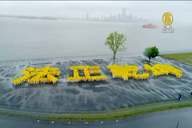 冷雨難擋感恩心 兩千法輪功學員紐約排字