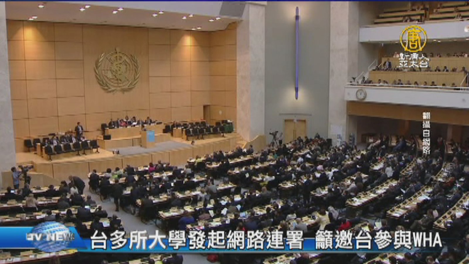世界衛生組織日前表態,沒有計畫邀請台灣參與本屆的世界衛生大會。台灣南部多所大學社團因此發起網路連署,希望能串連100萬人連署,呼籲WHO邀請台灣參與WHA,連署聲明中強調,如果把台灣拒於WHA門外,會讓台灣2300萬人健康面臨威脅,要求WHO重視健康人權。 //asset3.ntdtv.com.tw/public/uploads/assets/2017/05/14/2017-05-14-59184c2154db5.mp4 世界衛生大會|WHO|WHA|連署|大學生2017-05-14 20:20:35