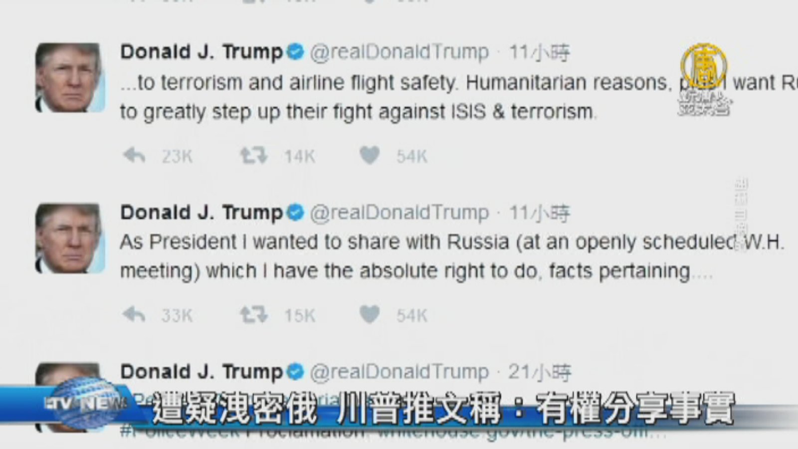 美國媒體爆料,說川普上個月與「俄羅斯外長」會面期間,洩露了美國高度機密的情報資訊。對此,川普回應說,分享資訊是總統的權利。而白宮國安顧問 麥馬斯特 則是嚴正駁斥報導不實,他強調川普的做法,「完全恰當」,而且說了9次。 //asset2.ntdtv.com.tw/public/uploads/assets/2017/05/17/2017-05-17-591c44a335829.mp4 川普|俄羅斯外長|洩露機密|麥馬斯特2017-05-17 20:38:23