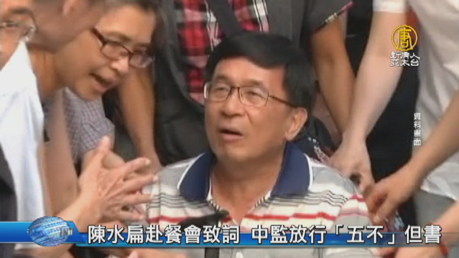 再來看到今晚最新情況,台中監獄對阿扁前總統,開出「五不」條件,而陳水扁一到典華飯店,就由民進黨立法院黨團總召柯建銘陪同進入會場,並改以錄影方式向現場支持者說話。 //asset1.ntdtv.com.tw/public/uploads/assets/2017/05/19/2017-05-19-591eecf8ce5e8.mp4 陳水扁|阿扁|主桌|致詞2017-05-19 21:20:34