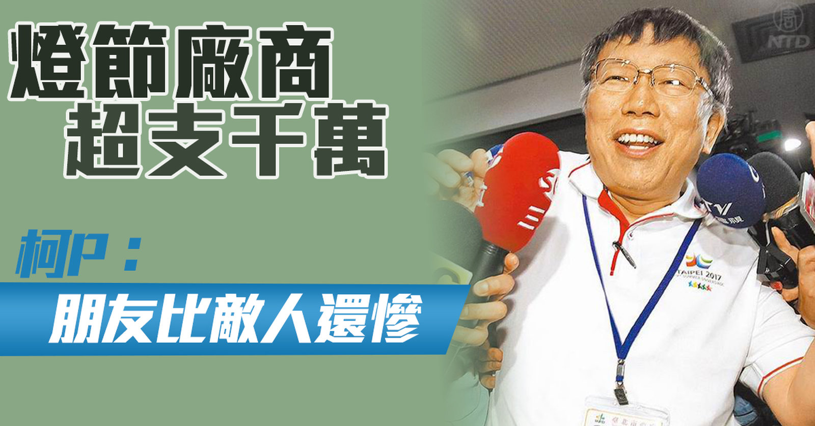 再來看到,今年台北燈節辦的獲得好評,但傳出活動花費了1.2億元,嚴重超支,讓廠商慘賠2000萬,對此,柯文哲今天回應表示,有時候當柯文哲的朋友比當柯文哲敵人還慘。 //asset1.ntdtv.com.tw/public/uploads/assets/2017/05/25/2017-05-25-5926d5b0aaf19.mp4 柯文哲|燈會|台北燈節|代金制|容積2017-05-25 20:58:12