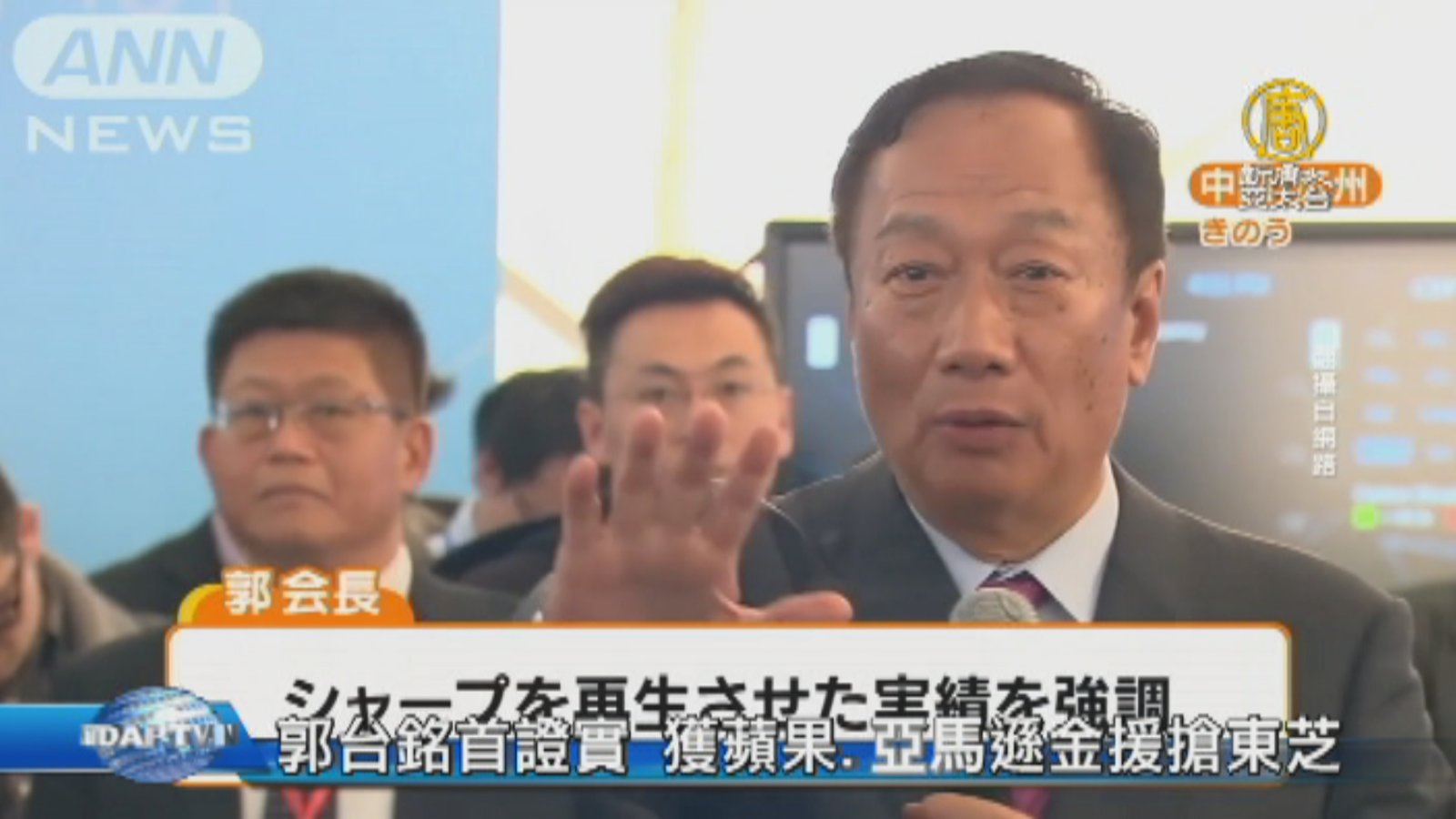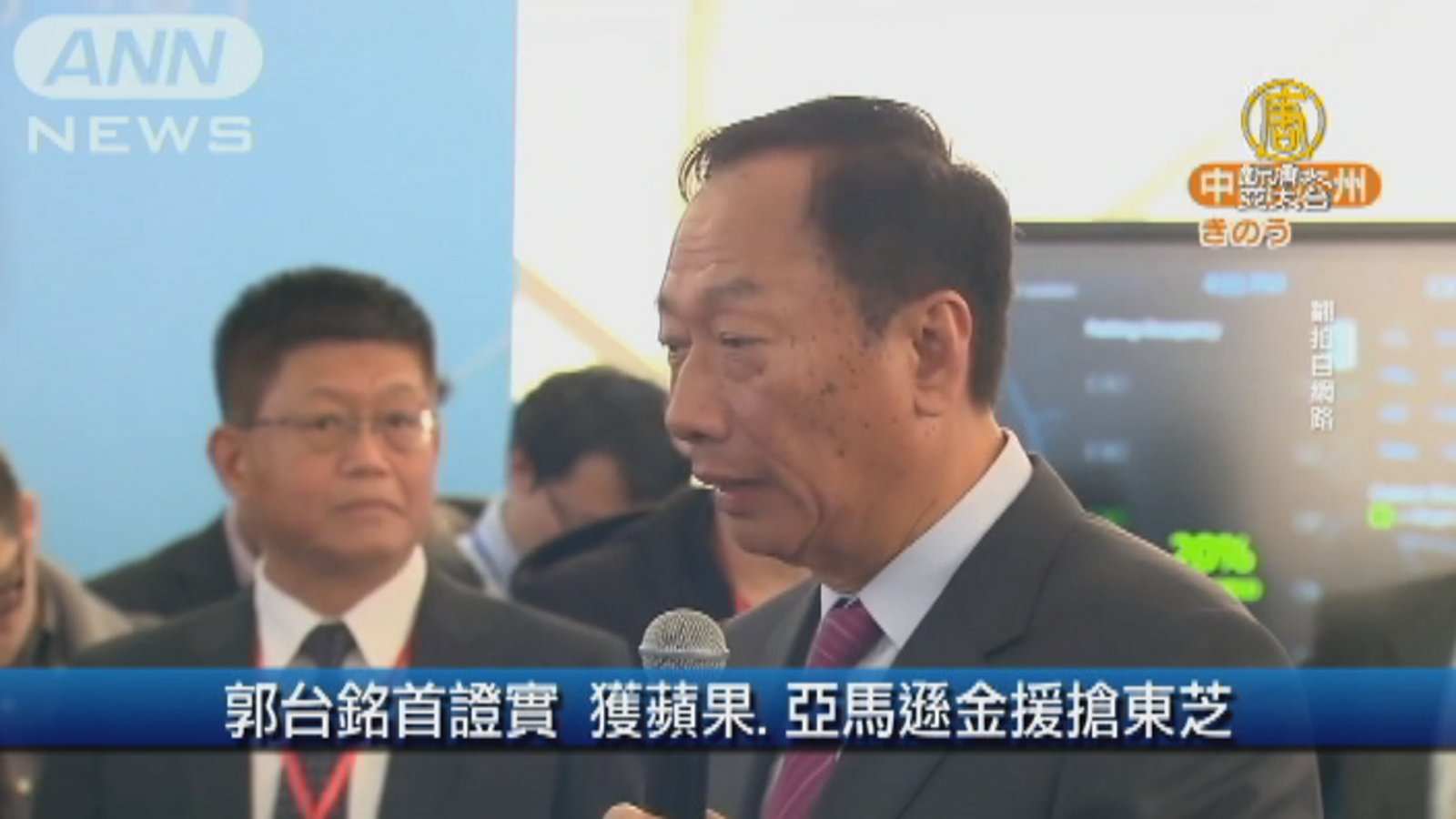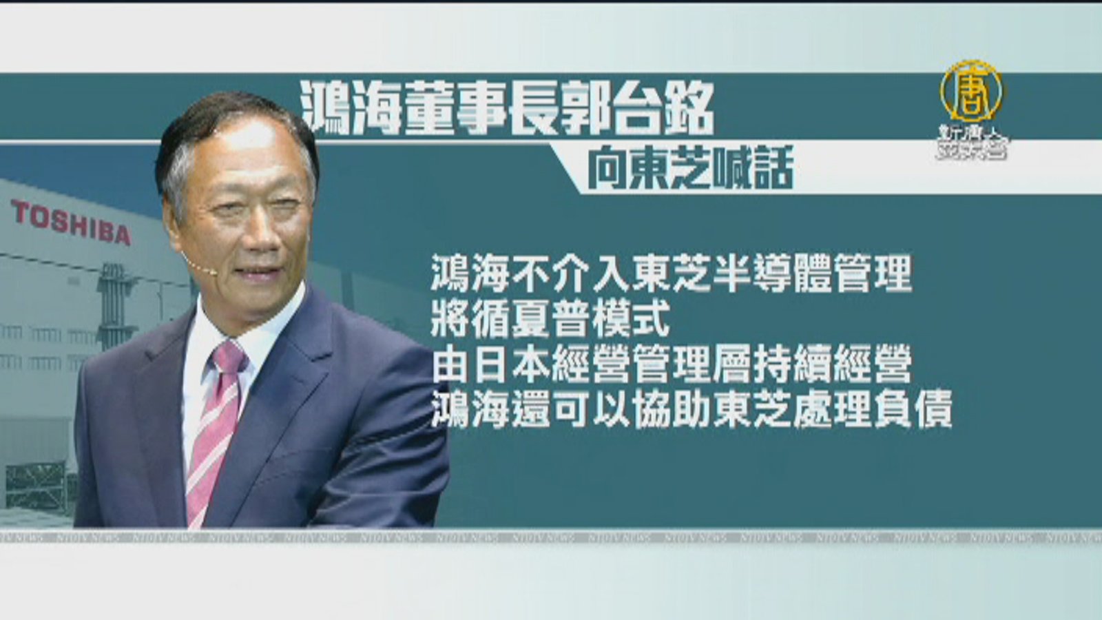 日本東芝記憶體股權出售目前還在第二階段,日媒報導,鴻海集團董事長郭台銘接受專訪表示,已經獲得蘋果和亞馬遜的支持,參與競標東芝記憶體,但不透露有多少資金挹注,不過報導指出,鴻海將是競標人馬中,出價最高,可能超過2兆日圓,也就是,超過新台幣5400億元。 //asset3.ntdtv.com.tw/public/uploads/assets/2017/06/05/2017-06-05-59354c80bd3d9.mp4 鴻海東芝|郭台銘|夏普|蘋果|亞馬遜2017-06-05 20:14:57