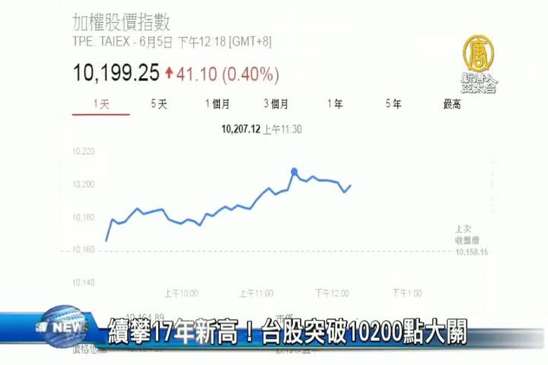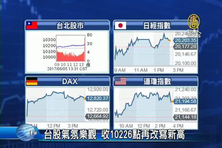 財經消息,先來看到,上週六,台股獨家,開市雖然指數收紅,但是少了外資的挹注,市場量能偏低。今天內外資回流,成交量恢復正常,大型股與中小型股各自表現,大盤緩步墊高,尾盤拉升收高上漲 68 點,以 10226 點作收,又刷新紀錄,成交量則是 926 億元。本周在那斯指數創高、美國ISM製造業指數、ADP就業人數,都優於預期等利多帶動下,預期台股將維持震盪盤堅格局。 //asset2.ntdtv.com.tw/public/uploads/assets/2017/06/05/2017-06-05-59354b321f846.mp4 台股2017-06-05 20:10:28
