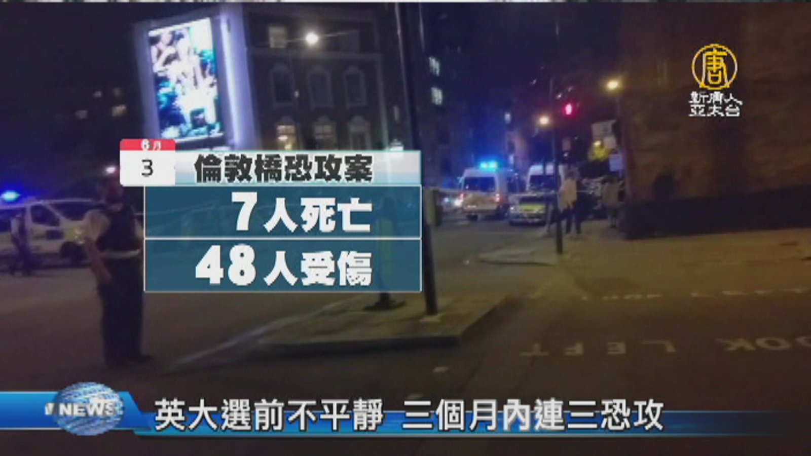 這週四,英國就要舉行國會大選,但大選前夕,真的很不平靜,3月22日以來,短短三個月內,就已經發生了3起完全沒有模式可以依循的恐攻,先是在3月22號,英國國會大樓附近的西敏橋,兇手駕駛一輛汽車衝撞行人,隨後持刀攻擊警衛,導致共6人死亡,約50人受傷。接著5月22號,美國歌手亞莉安娜在曼徹斯特競技場舉行演唱會,演唱會接近尾聲時,恐怖份子引爆炸彈,導致23人死亡,119人受傷。接著不到兩週,倫敦橋也同樣遭遇恐怖襲擊,兇手駕車衝撞民眾,隨後用刀攻擊路人,造成至少7人死亡,48人受傷。 //asset2.ntdtv.com.tw/public/uploads/assets/2017/06/05/2017-06-05-59354d91a1655.mp4 恐怖攻擊|英國|倫敦橋2017-06-05 20:21:52