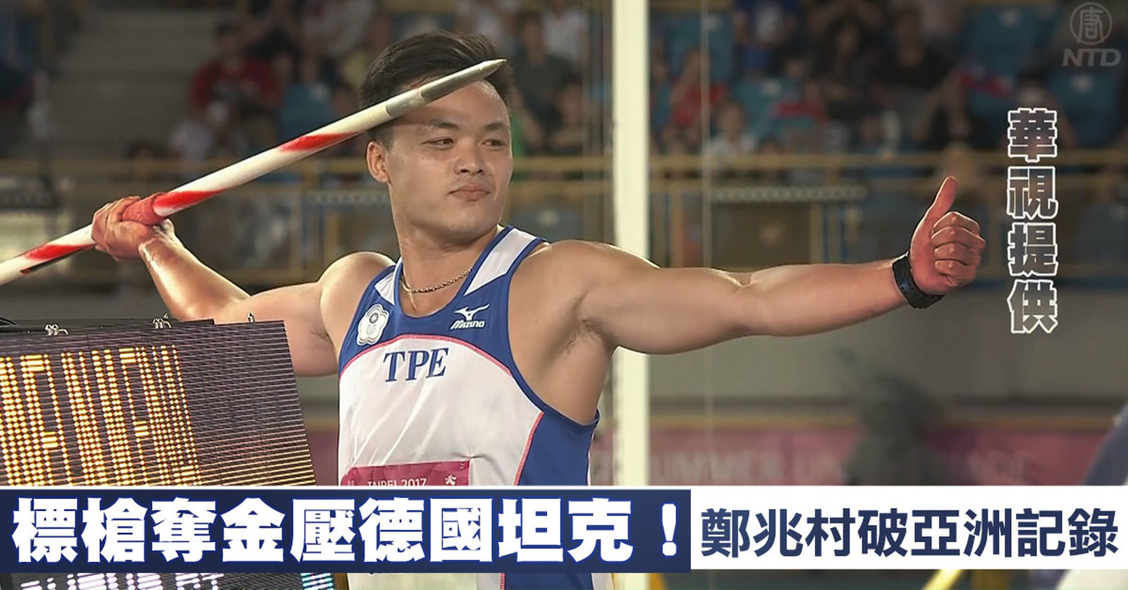 田徑場捷報不斷,男子標槍鄭兆村、黃士峰兩人都丟出大會紀錄,鄭兆村最後1次試擲以91公尺36的成績,打破亞洲記錄,奪下金牌。 //asset3.ntdtv.com.tw/public/uploads/assets/2017/08/26/2017-08-26-59a1771da9dc7.mp4 世大運|標槍|鄭兆村|黃士峰2017-08-26 21:32:52
