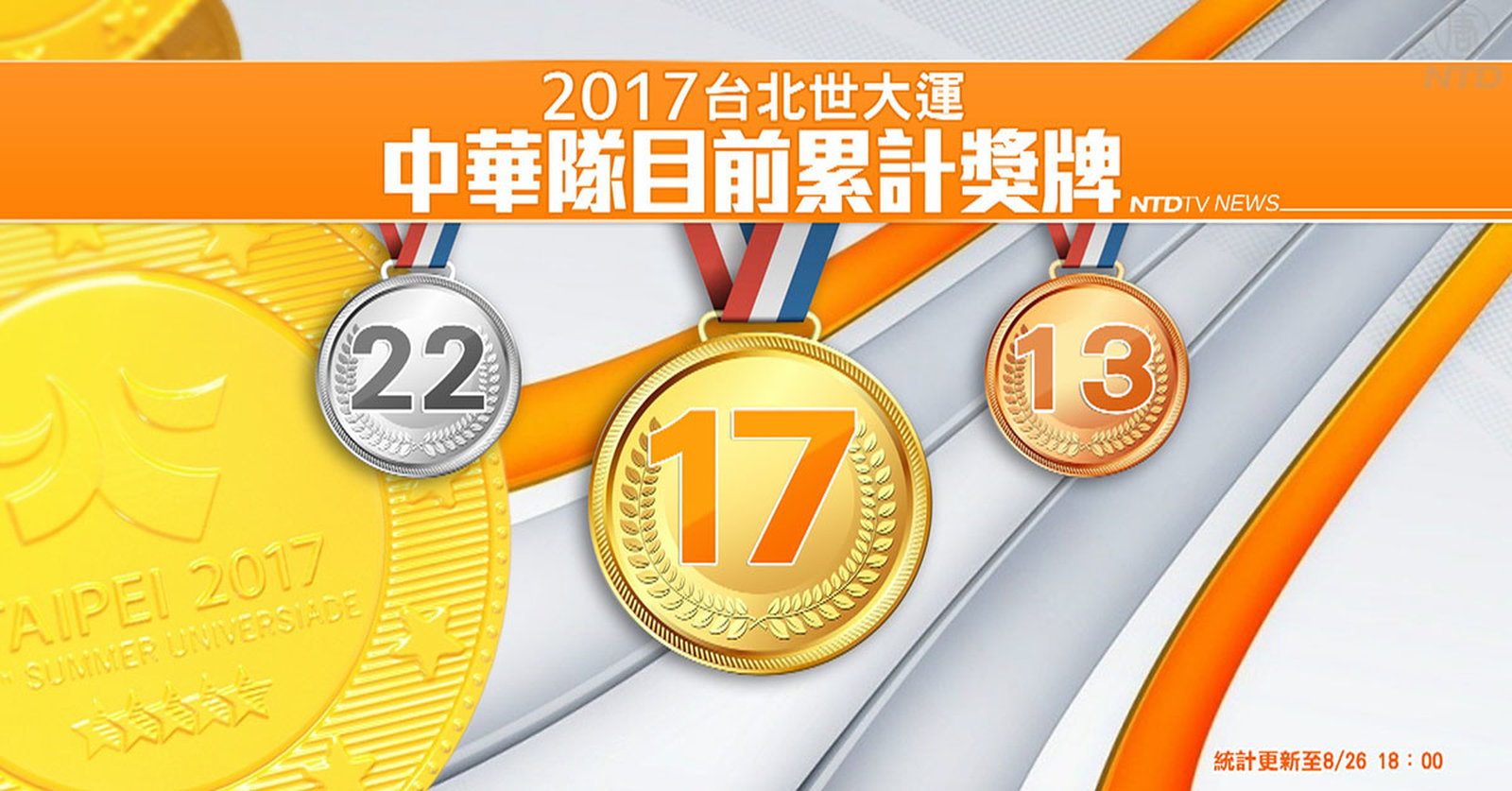 好,是不是有地主優勢的關係呢?來看到,中華隊在世大運的表現相當優異,截至目前為止,中華隊獎牌數統計,排名第三,共拿到17金,22銀,13銅,落後韓國的25面金牌,以及日本的23面金牌。 //asset1.ntdtv.com.tw/public/uploads/assets/2017/08/26/2017-08-26-59a1641479177.mp4 世大運|中華隊|獎牌數2017-08-26 20:56:06