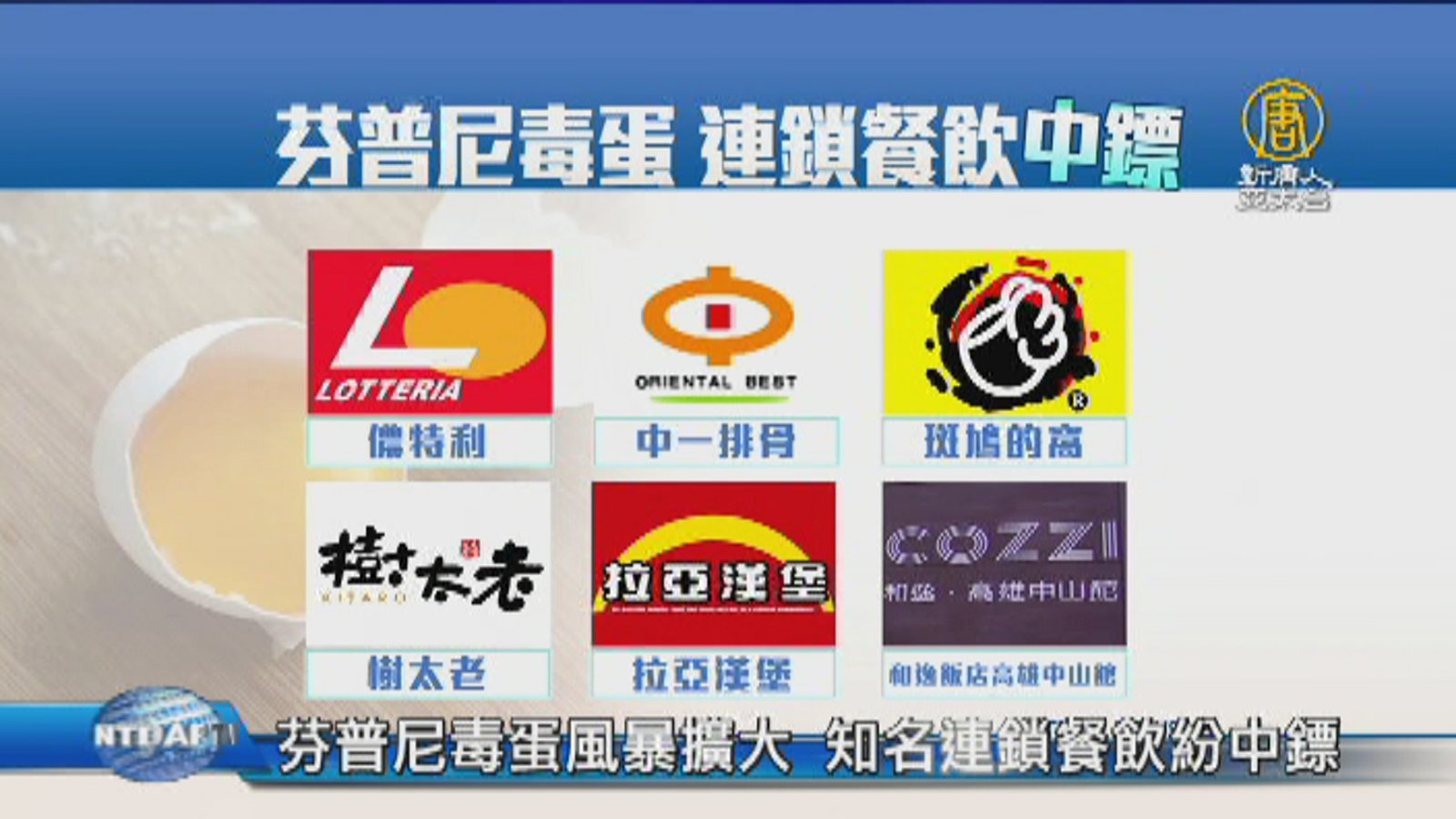 歡迎回來。來關心,芬普尼毒蛋風波,目前全台,共有44家雞場淪陷,而其中,從台南市的牧場流出的雞蛋,讓下游食品大廠:大成長城食品公司,也中鏢,流向了6縣市18家糕餅、早餐店,還有連鎖餐飲。 //asset2.ntdtv.com.tw/public/uploads/assets/2017/08/26/2017-08-26-59a176ce40490.mp4 芬普尼|毒蛋|大成長城食品公司|連鎖餐飲|儂特利|中一排骨|斑鳩的窩|樹太老|拉亞漢堡2017-08-26 21:25:42