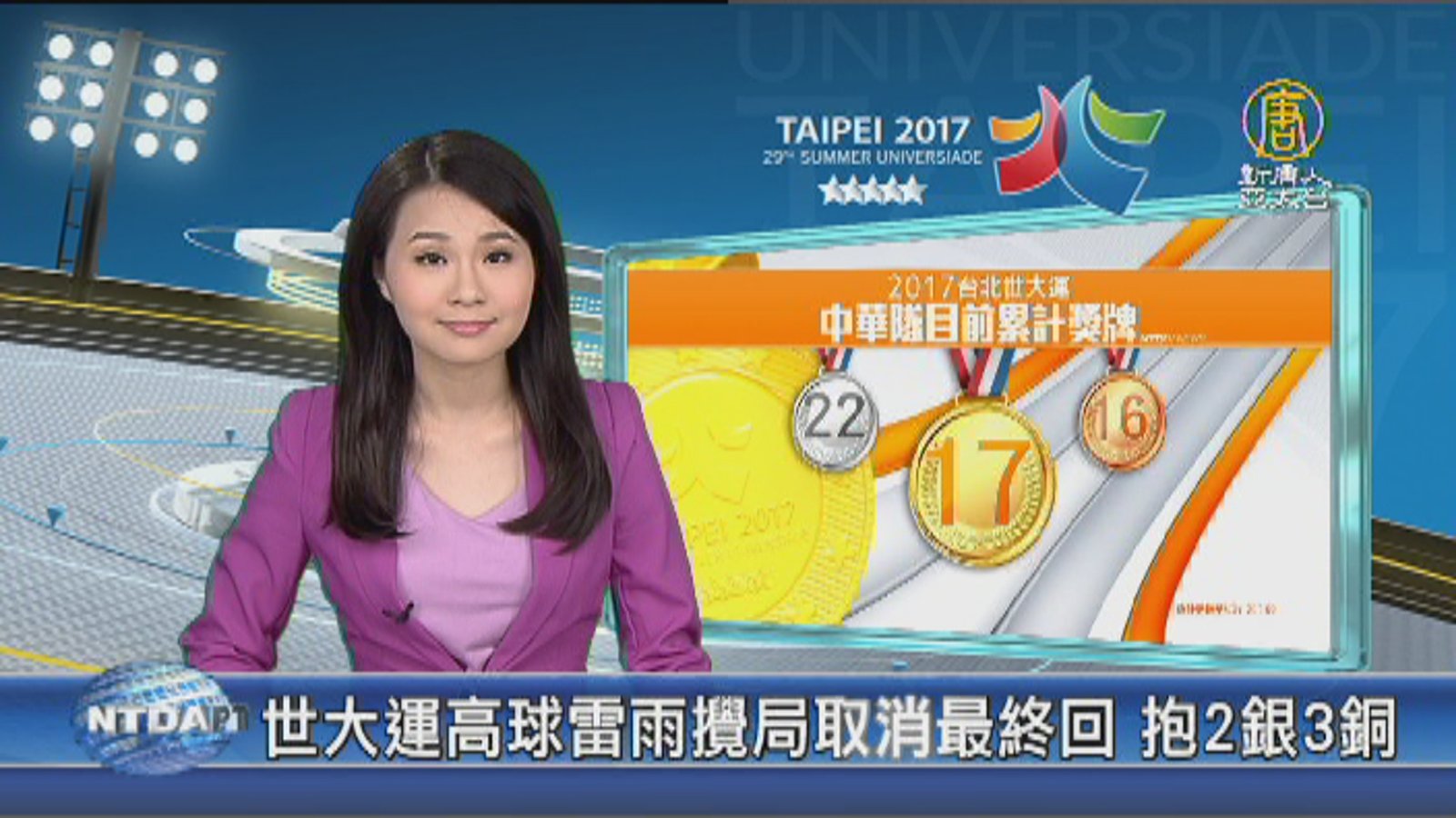 世大運今天進行高爾夫比賽 最終回合,可惜天公不作美,兩度因雷雨取消,最後大會技術委員裁定,取消第4回合的比賽,以第3回合成績作為最終成績,女子個人 侯羽桑 和 陳萱 並列第2,男子個人 俞俊安、劉永華並列第三。截至目前,中華隊累計共獲得 17金, 22銀, 16銅,位居獎牌板第三名。 //asset2.ntdtv.com.tw/public/uploads/assets/2017/08/27/2017-08-27-59a2bcd5a7b43.mp4 世大運|高爾夫球|陳萱|侯羽桑|獎牌榜2017-08-27 20:36:43