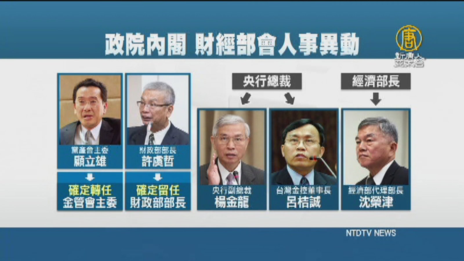 好,新閣揆新氣象,賴清德早上八點多北上,開完記者會後,下午就馬不停蹄的徵詢副閣揆,找來財經幫的證交所董事長施俊吉,要協助賴清德,完成總統交付的七項任務,而另一個讓人跌破眼鏡的人事任命,就是涉及高度專業的中立機構金管會,將要由缺乏財經背景的黨產會主委顧立雄接任。 //asset3.ntdtv.com.tw/public/uploads/assets/2017/09/05/2017-09-05-59aea2096b24f.mp4 賴清德|內閣改組|人事|施俊吉|顧立雄2017-09-07 11:51:09