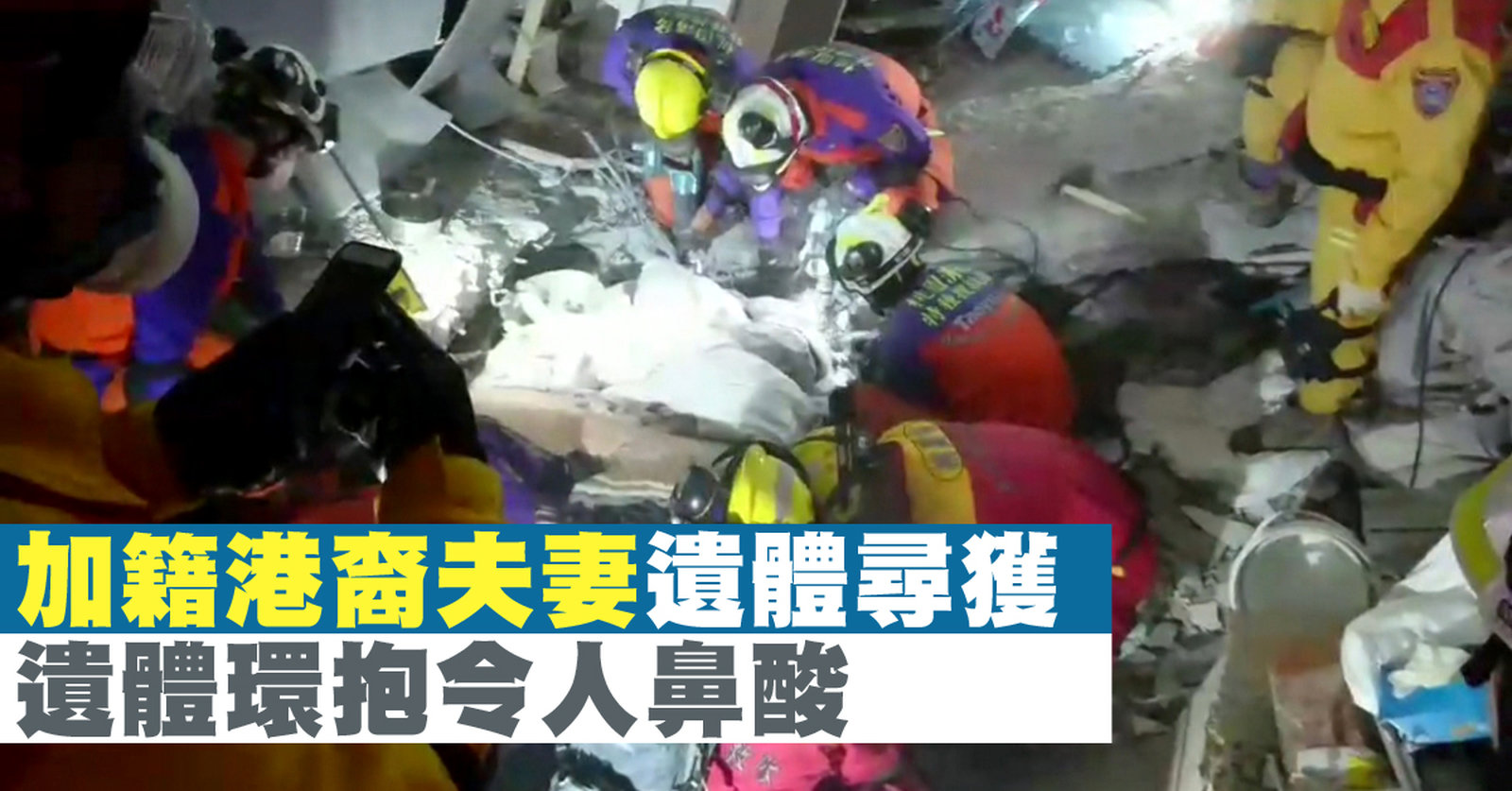 再來看到,花蓮雲翠大樓在地震中倒塌,搜救人員不分晝夜尋找一對加拿大籍香港裔夫妻,與陸客三代一家五口。今天下午,救難人員在漂亮生活旅店213號房,也就是地震當晚加拿大夫妻入住的房間,發現兩人遺體,被水泥板壓住,明顯沒有生命跡象。兩人被發現時,遺體呈現環抱姿勢,現場令人鼻酸。 //asset3.ntdtv.com.tw/public/uploads/assets/2018/02/09/2018-02-09-5a7d900f9f20a.mp4 花蓮強震2018-02-09 21:08:16