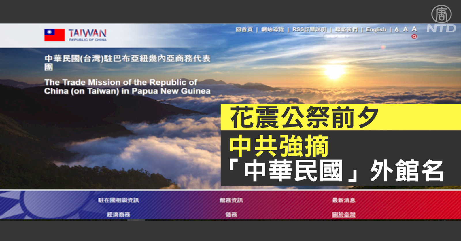 歡迎回來。花蓮12日舉行地震罹難者公祭,就在前一天,中共外交部施壓巴布亞紐幾內亞政府,勒令台灣駐巴國代表處的正式名稱拿掉「中華民國」,改名「台北」。上午,外交部對此表示遺憾,認為這將引起反感。這是中共去年以來強迫改名的第六個台灣駐外館處。 //asset3.ntdtv.com.tw/public/uploads/assets/2018/02/13/2018-02-13-5a82da2a559ab.mp4 花蓮強震|中共外交打壓|強摘國號|中華民國2018-02-13 20:28:02
