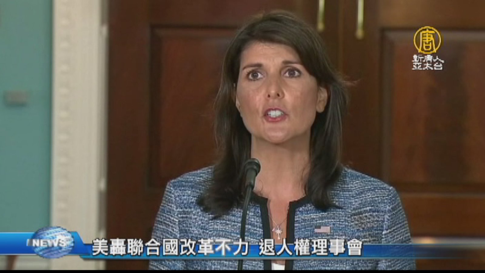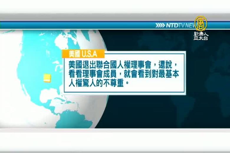 新聞焦點,再來看到,美國政府週二宣布,退出聯合國人權理事會。美國駐聯合國大使海利與國務卿蓬佩奧,聯合發布聲明,稱人權理事會淪為踐踏人權者的保護傘,美國不會同流合污。 //asset2.ntdtv.com.tw/public/uploads/assets/2018/06/20/2018-06-20-5b2a45d264b0b.mp4 美國|聯合國人權理事會|川普|蓬佩奧|海利2018-06-20 22:07:31