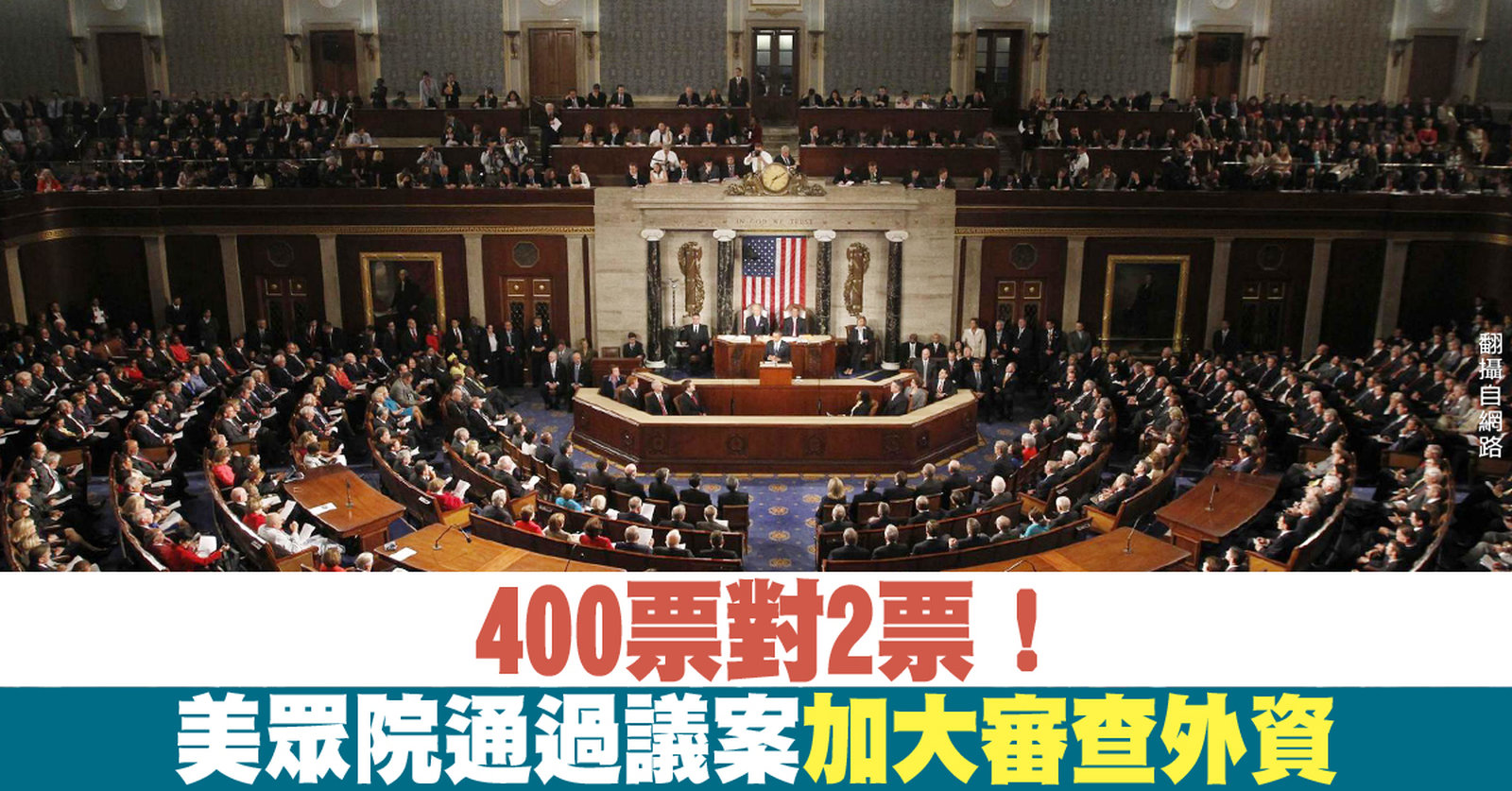 新聞首先,來關心美中貿易攻防,最新消息。美國眾議院,昨天(26號)以400票對2票,壓倒性票數,通過議案,允許外國投資委員會擴大審查權力,對外資進行審查,目的是保護美國的先進技術及知識產權。而法案內容,則是特別點名中國大陸資金。我們今天的,頭條報導。 //asset3.ntdtv.com.tw/public/uploads/assets/2018/06/27/2018-06-27-5b338ec698ca8.mp4 美中貿易戰2018-06-28 10:20:35