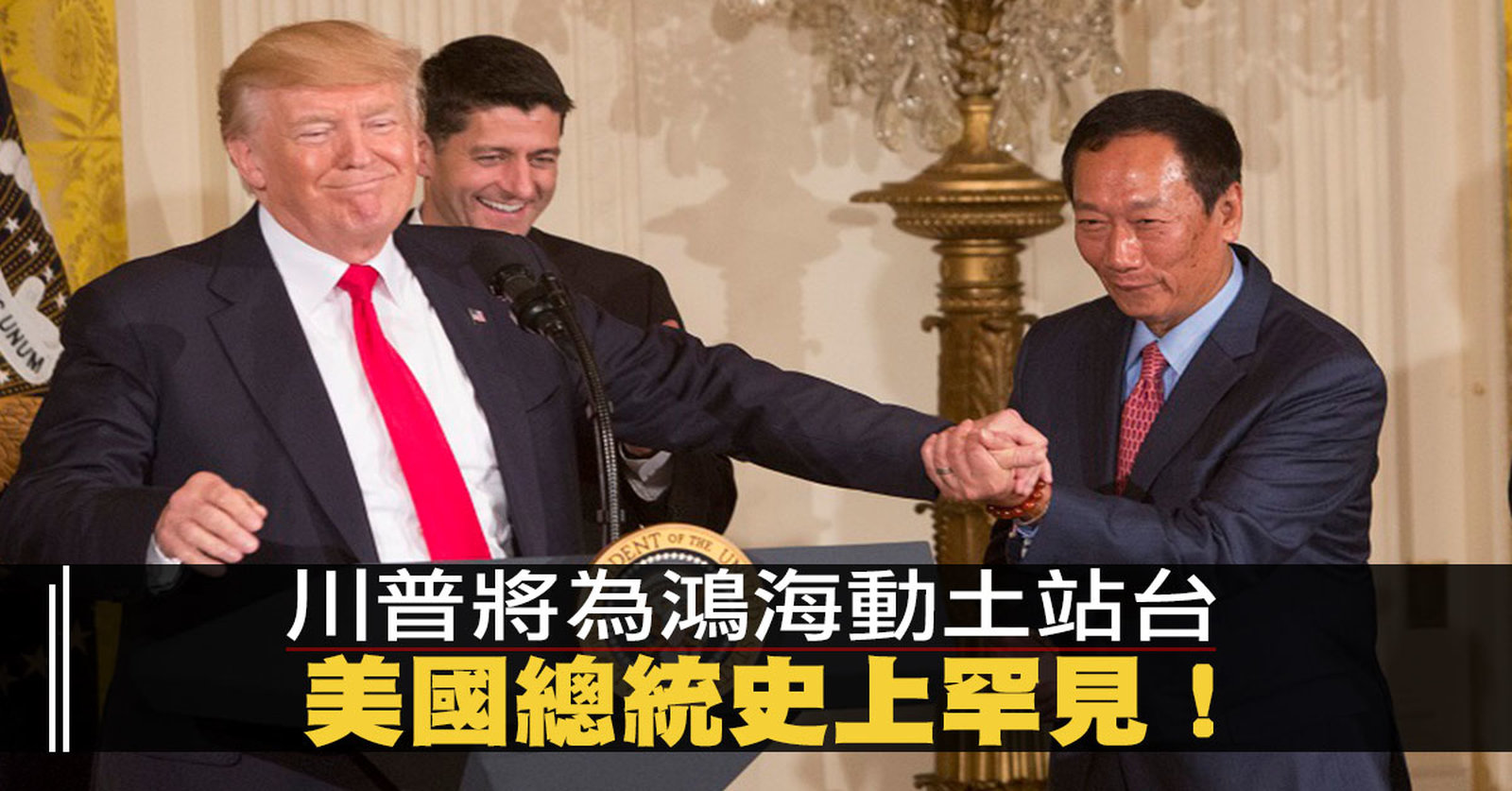 再來看到,美國總統川普預計將在明天晚間,抵達威斯康辛州,與鴻海董事長郭台銘同台、參加富士康面板廠的動土典禮,這可以說,在美國總統史上,實屬罕見。去年4月,川普為鴻海在美國投資8K面板廠,召開記者會,創下兩人同台的歷史鏡頭,這也是台資企業受美國總統邀請、在白宮召開記者會的首例。而明天,川普將親自參加鴻海威州設廠的動土典禮,等於是,川普為台灣企業家郭台銘,又一次創下了罕見先例。 //asset1.ntdtv.com.tw/public/uploads/assets/2018/06/27/2018-06-27-5b337fd765387.mp4 富士康面板廠|動土|鴻海|郭台銘|川普|威斯康辛州2018-06-27 20:57:17