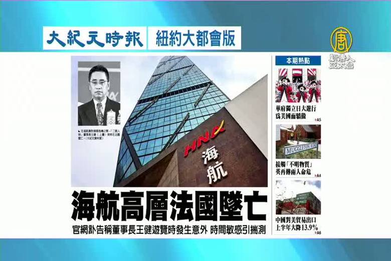 正當海航集團陷入資金鏈斷裂、出現官商勾結醜聞之時,董事長王健,突然身亡,引發外界強烈質疑。而您知道嗎,其實中國還有許多企業高管,在敏感時刻「突發」意外死亡,時機和背景,都有著驚人巧合 。繼續是我們的報導。 //asset2.ntdtv.com.tw/public/uploads/assets/2018/07/06/2018-07-06-5b3f637a2b061.mp4 死亡|王健|海航|陳小魯|安邦|徐明|薄熙來|高管2018-07-06 20:39:44