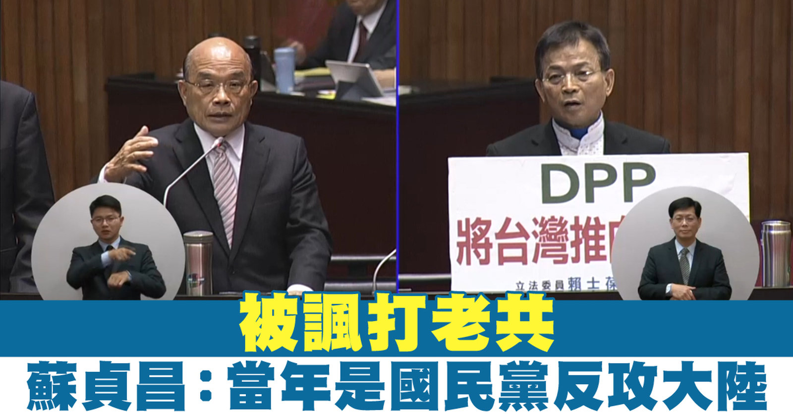 行政院長蘇貞昌今天(22日)到立法院備詢,就和平協議議題,國民黨立委認為蘇貞昌要戰爭不要和平,批評蘇貞昌大張旗鼓要「上山打老共」,是為了挽救民調,但卻讓台灣人陷入戰爭。蘇貞昌則回覆說,當年喊反攻大陸的是國民黨。 //asset2.ntdtv.com.tw/public/uploads/assets/2019/02/22/2019-02-22-5c6fe8631f350.mp4 蘇貞昌|兩岸2019-02-23 14:10:00