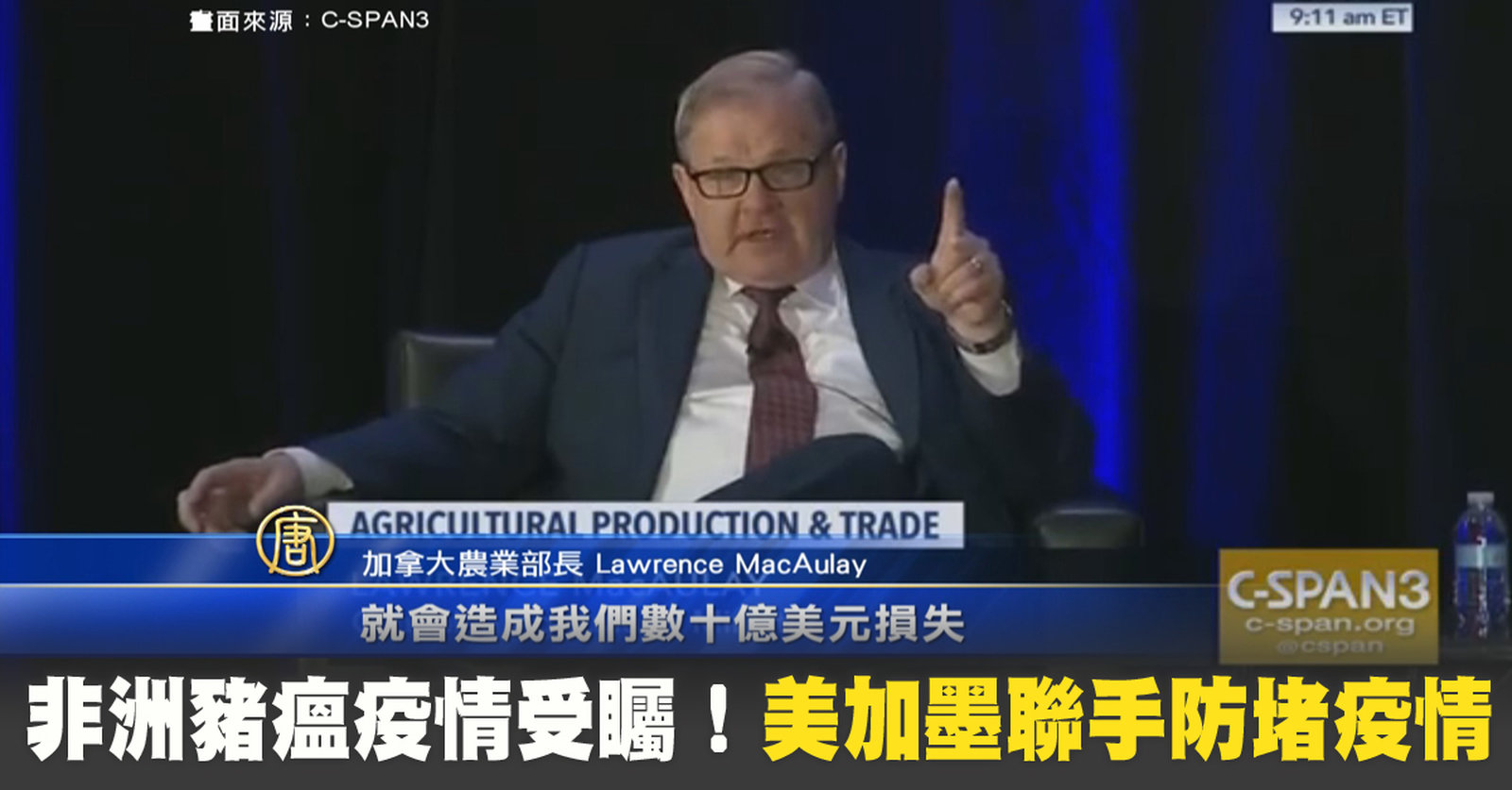 歡迎回來。中國去年8月,爆發非洲豬瘟疫情,才短短半年,就蔓延到只剩四省區沒有出現疫情,引發全球關注。21、22號兩天,美國農業部舉行年度展望論壇,美國、加拿大、墨西哥三國農業部長同台討論農業議題,民眾提出的第一個問題,就是非洲豬瘟。 //asset2.ntdtv.com.tw/public/uploads/assets/2019/02/22/2019-02-22-5c6febe80f5a6.mp4 非洲豬瘟|美國|加拿大|墨西哥2019-02-22 20:56:01