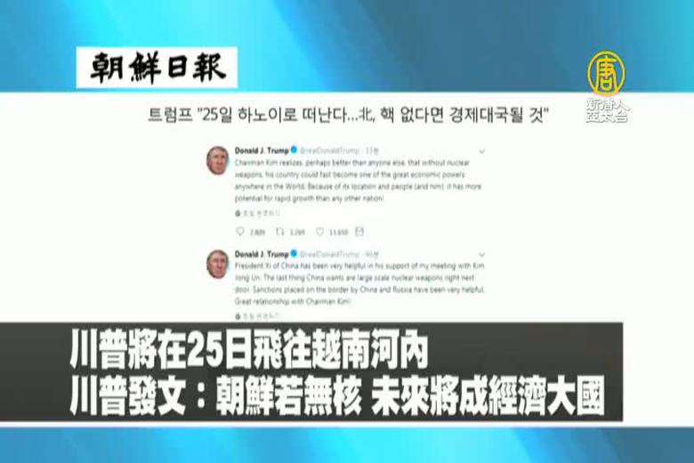 另外來看到,眾所矚目的「川金二會」,週三下午,就要在越南河內登場,美國總統川普表示,他期待能夠延續上次川金會的承諾,繼續北韓無核化的進程。目前川普已經搭上空軍一號前往河內,預定在台灣時間明天晚上9時30分飛抵越南,而金正恩這次沒有先見習近平,直接搭乘專列火車前往河內,明天清晨就會到中越邊境。 //asset3.ntdtv.com.tw/public/uploads/assets/2019/02/25/2019-02-25-5c73dbca2f98b.mp4 川金二會|去核化|蓬佩奧|習近平|越南|河內2019-02-25 20:35:38